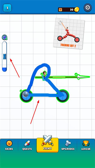 1、在組裝界面,搭建角色的機(jī)械結(jié)構(gòu),完成配置后點(diǎn)擊FIGHT!進(jìn)入對(duì)戰(zhàn)。