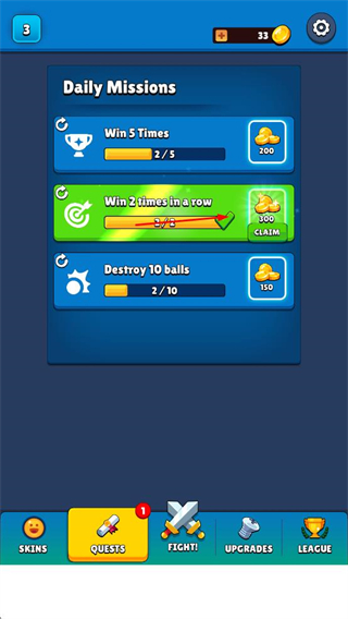 4、在任務(wù)界面,完成每日任務(wù),點(diǎn)擊CLAIM領(lǐng)取金幣獎(jiǎng)勵(lì),積累資源用于升級(jí)。
