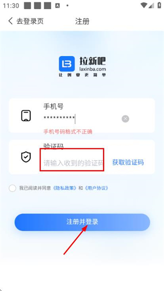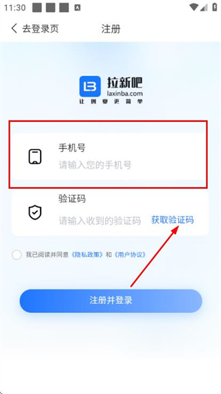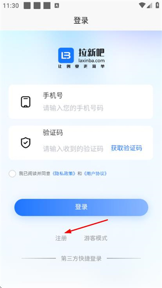 1、在拉新吧的登錄頁面,點(diǎn)擊注冊(cè)選項(xiàng),進(jìn)入賬號(hào)注冊(cè)頁面。