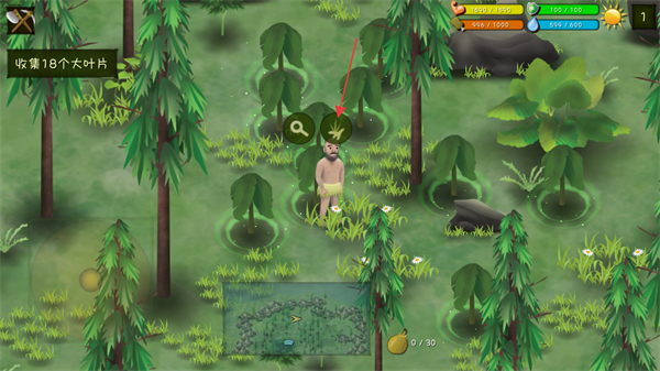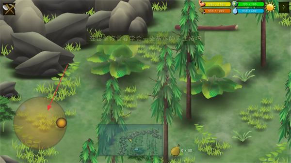 2、通過左下角的方向鍵控制角色移動(dòng),在森林中收集生存資源。