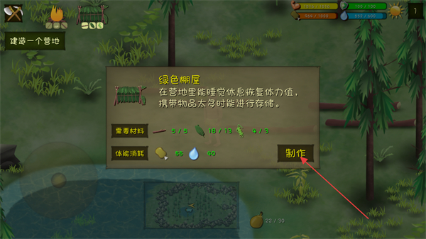 4、點(diǎn)擊左上角的工具按鈕,選擇建筑庇護(hù)所,點(diǎn)擊綠色棚屋的制作按鈕消耗體能屬性進(jìn)行搭建。
