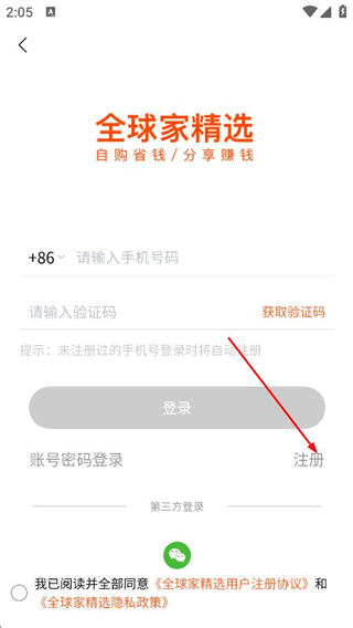 3、在登錄頁(yè)面,點(diǎn)擊注冊(cè),進(jìn)入手機(jī)注冊(cè)頁(yè)面來(lái)進(jìn)行下一步。