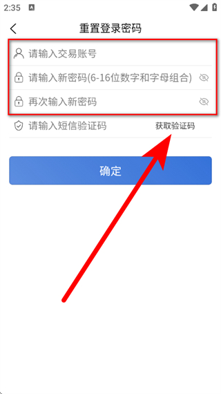 3、在重置密碼頁(yè)面,輸入交易賬號(hào),設(shè)置新密碼,點(diǎn)擊獲取驗(yàn)證碼。