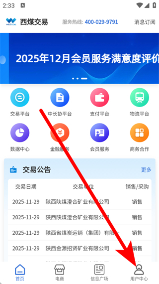 1、打開(kāi)西煤交易,在主界面點(diǎn)擊底部用戶中心,進(jìn)入登錄頁(yè)面。