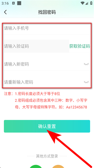 4、在找回密碼頁面,填寫手機(jī)號,設(shè)置新密碼后,點(diǎn)擊確認(rèn)重置,完成密碼找回。