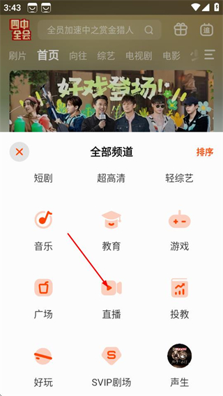 2、在全部頻道頁面,點(diǎn)擊直播選項(xiàng),進(jìn)入直播專區(qū)頁面。
