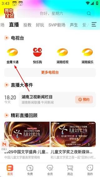 3、在直播專區(qū),可選擇感興趣的電視臺(tái)如金鷹卡通,點(diǎn)擊進(jìn)入。