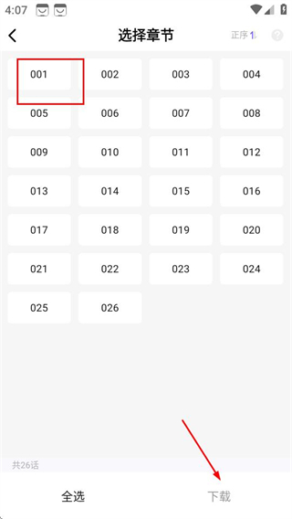 4、在章節(jié)選擇頁(yè)面,勾選要下載的章節(jié)后,點(diǎn)擊下載按鈕完成章節(jié)下載。