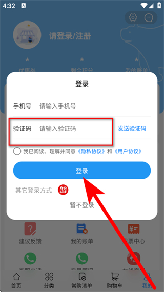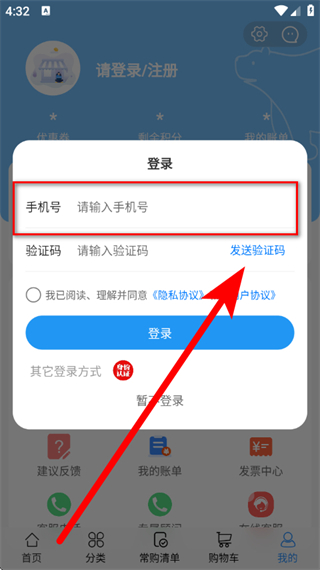3、在登錄頁面,輸入手機(jī)號(hào),點(diǎn)擊發(fā)送驗(yàn)證碼。
