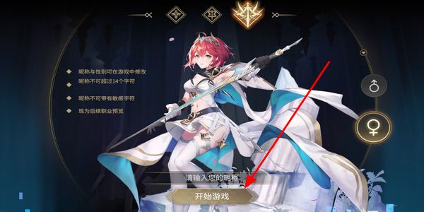 1、創(chuàng)建界面輸入符合要求的昵稱,選擇性別后點(diǎn)擊開始游戲,完成角色創(chuàng)建并進(jìn)入游戲流程。