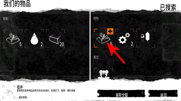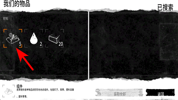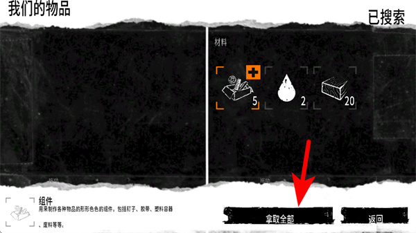 1、點擊獲取全部按鈕,將已搜索到的材料如組件、水滴全部收入物品欄,完成收集。