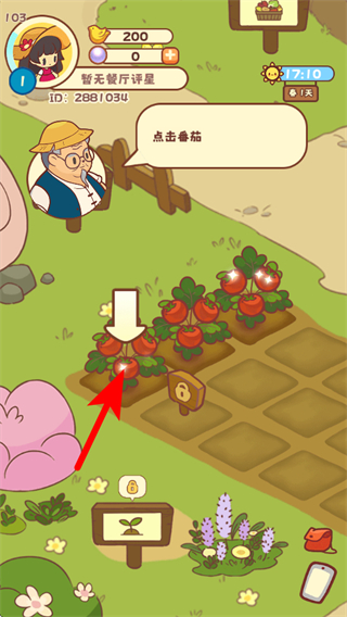 1、根據(jù)提示點擊農(nóng)田中的番茄,選中成熟的番茄作物,為后續(xù)收獲做準(zhǔn)備。