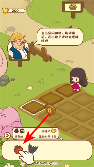 4、點擊番茄種子,拖動種子到選中的空閑田地上滑動,完成番茄的種植操作,等待作物生長。