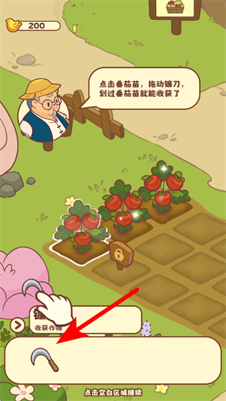 2、點擊界面中的鐮刀工具,拖動鐮刀劃過番茄苗區(qū)域,完成番茄的收獲操作,獲取番茄資源。