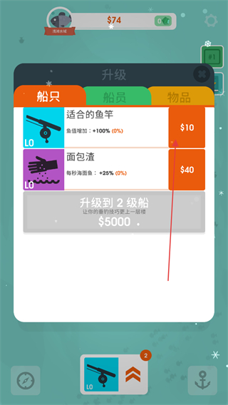 4、在升級界面選擇適合的魚竿等選項(xiàng),消耗金幣提升釣魚效率。
