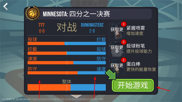 1、在賽事準(zhǔn)備界面,查看雙方屬性,選擇增益道具后點(diǎn)擊開始游戲,進(jìn)入對(duì)戰(zhàn)關(guān)卡。
