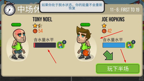 3、中場(chǎng)階段關(guān)注含水量水平,避免脫水狀態(tài),點(diǎn)擊玩下半場(chǎng)繼續(xù)賽事。