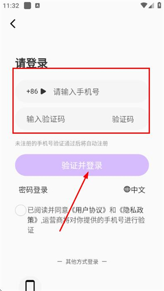 3、在登錄頁面填寫手機號和驗證碼,勾選協(xié)議后,點擊驗證并登錄完成賬號登錄操作。