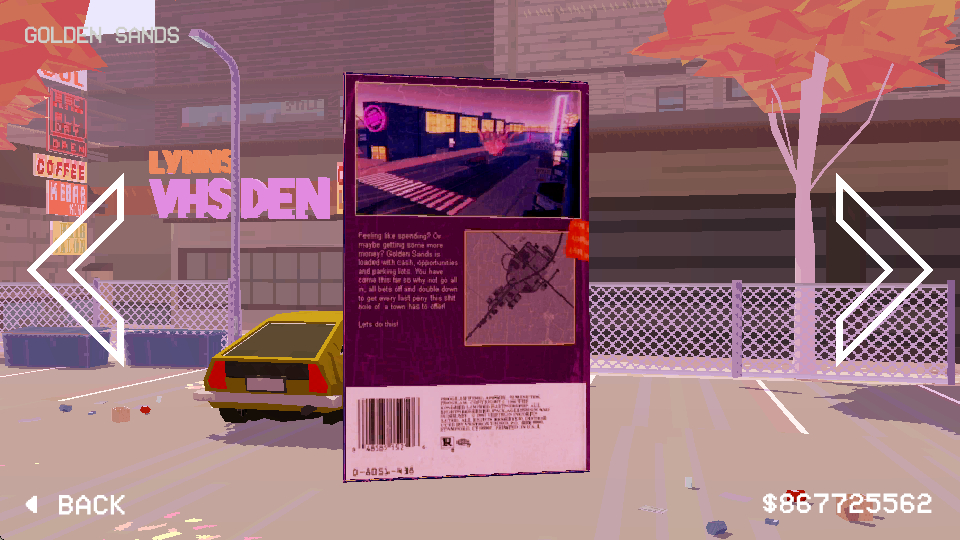 2、進(jìn)入初始場景后,操控車輛向標(biāo)注的目標(biāo)區(qū)域如GOLDEN SANDS CHEAP-O移動,這是推進(jìn)游戲的核心操作,前往目標(biāo)區(qū)域可獲取金錢等資源,同時(shí)解鎖后續(xù)的路線。