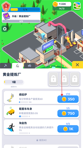 3、打開提煉廠升級(jí)界面,點(diǎn)擊感應(yīng)爐對(duì)應(yīng)的按鈕花費(fèi)350金幣升級(jí)。