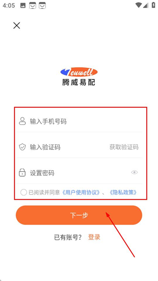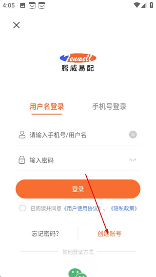 1、在騰威易配的登錄頁(yè)面,點(diǎn)擊創(chuàng)建賬號(hào)選項(xiàng),進(jìn)入注冊(cè)頁(yè)面。