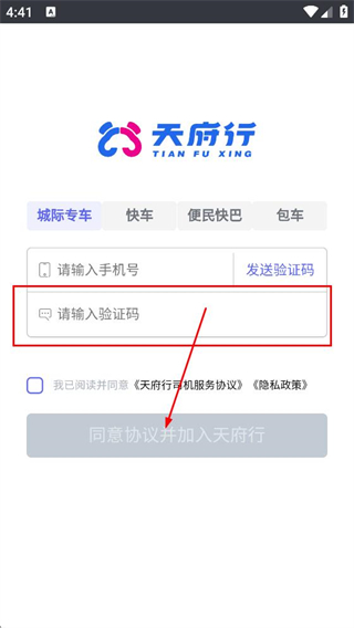 3、在頁面中填寫收到的請輸入驗證碼,完成天府行司機(jī)端的注冊/登錄操作。