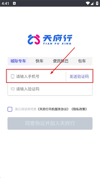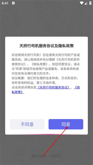 1、在天府行服務(wù)協(xié)議及隱私政策彈窗中,點(diǎn)擊同意,進(jìn)入注冊/登錄頁面。
