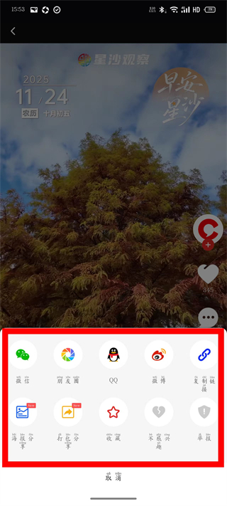 4、在分享菜單中,點(diǎn)擊選擇對(duì)應(yīng)渠道,完成視頻內(nèi)容的分享操作。