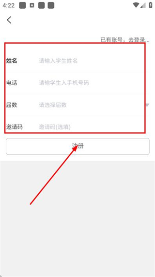 3、在注冊頁面填寫學(xué)生姓名、手機(jī)號碼、屆數(shù)等信息后,點擊注冊按鈕完成賬號注冊操作。