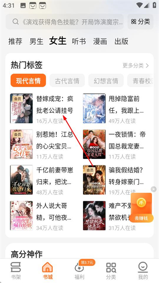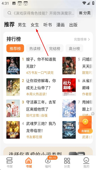 1、在秘讀APP的書城頁面,點(diǎn)擊女生分類標(biāo)簽,進(jìn)入女生頻道頁面。