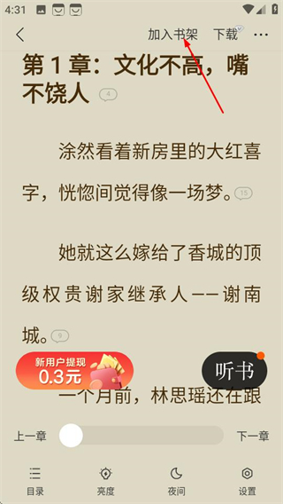 4、在菜單功能頁,點(diǎn)擊加入書架,即可將該小說添加至?xí)堋?