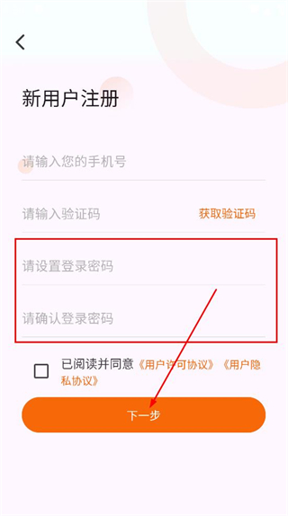 4、在新用戶注冊頁面,設置登錄密碼并確認登錄密碼,點擊下一步,完成注冊操作。
