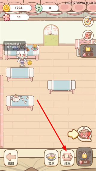 1、進(jìn)入妖怪旅店主界面,找到下方的設(shè)施按鈕并點(diǎn)擊,點(diǎn)擊后進(jìn)入家具選擇頁面。
