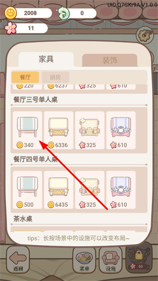 2、在家具頁面選擇對應(yīng)區(qū)域的家具,比如餐廳分類下的餐廳三號單人桌。