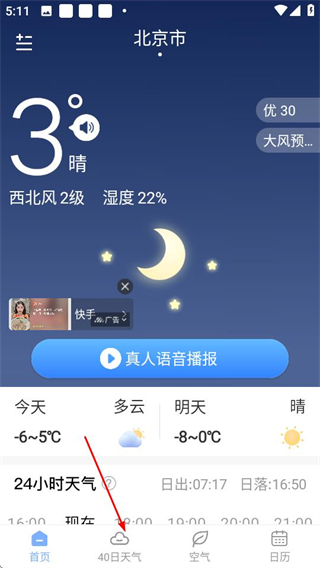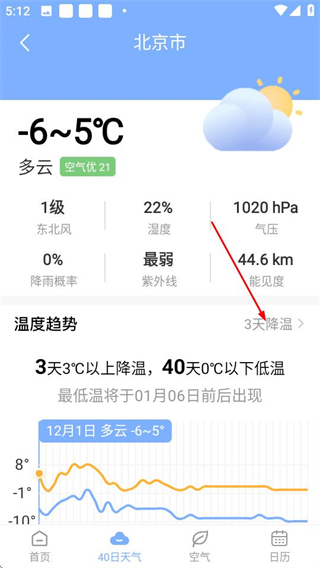 2、在40日天氣頁(yè)面,可查看近期的溫度趨勢(shì)及降溫提示等信息。