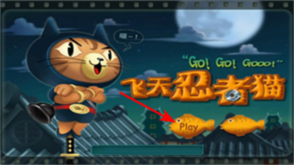 1、在游戲的啟動界面,點擊Play按鈕進入游戲關(guān)卡,開啟飛天忍者貓的闖關(guān)挑戰(zhàn),同時可查看界面顯示的角色與主題元素。