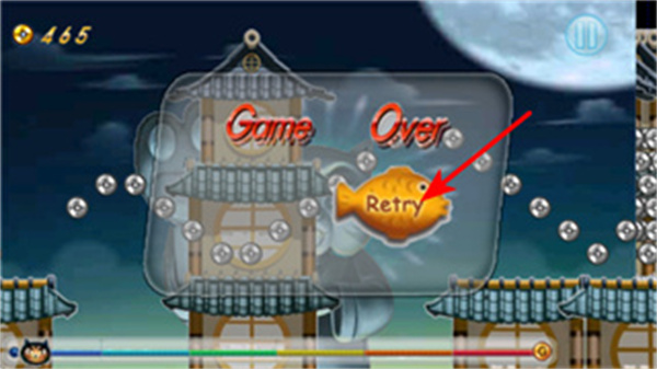3、若闖關(guān)失敗出現(xiàn)Game Over提示,點擊Retry按鈕重新開始關(guān)卡挑戰(zhàn),借助之前的操作經(jīng)驗調(diào)整移動節(jié)奏,避開更多障礙提升表現(xiàn)。
