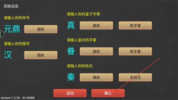 2、初始設(shè)定界面內(nèi),設(shè)置國家的年號、姓氏等信息,完成填寫后點擊確認(rèn)按鈕進(jìn)入游戲。