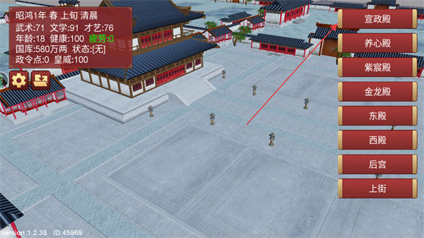 3、屏幕左上角顯示的是當(dāng)前國家以及君王的具體情況,點擊右側(cè)的建筑名稱可以前往建筑觸發(fā)劇情。