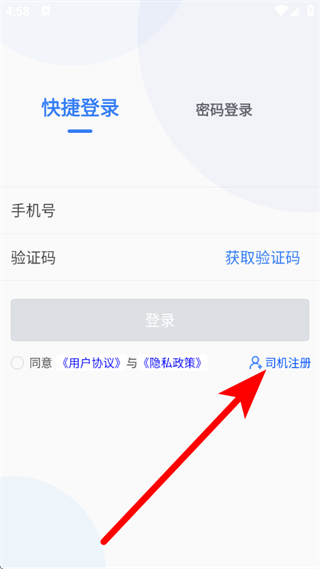 2、在快捷登錄頁面,點(diǎn)擊司機(jī)注冊,進(jìn)入手機(jī)驗(yàn)證注冊頁面。