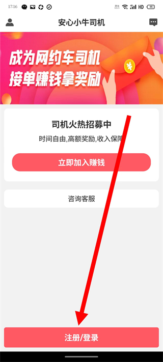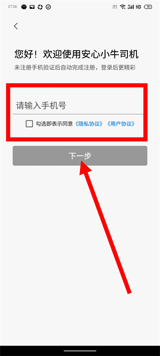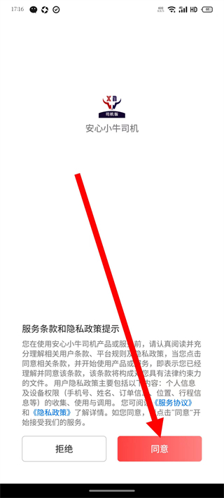 1、打開安心小牛司機端,在服務條款彈窗中,點擊同意,進入主界面。