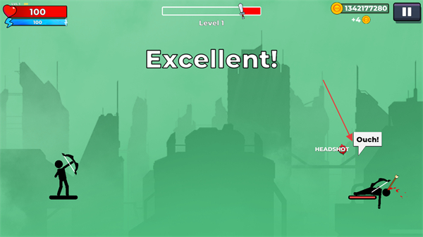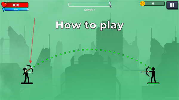 2、拖動(dòng)火柴人手中的弓箭進(jìn)行瞄準(zhǔn),松手即可釋放弓箭進(jìn)行攻擊。