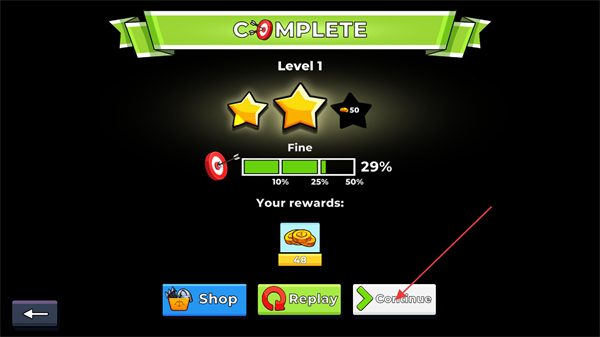 4、關(guān)卡結(jié)算界面根據(jù)游戲獲取到的星級(jí)評(píng)分獲取金幣獎(jiǎng)勵(lì),點(diǎn)擊Continue按鈕執(zhí)行下一步操作。