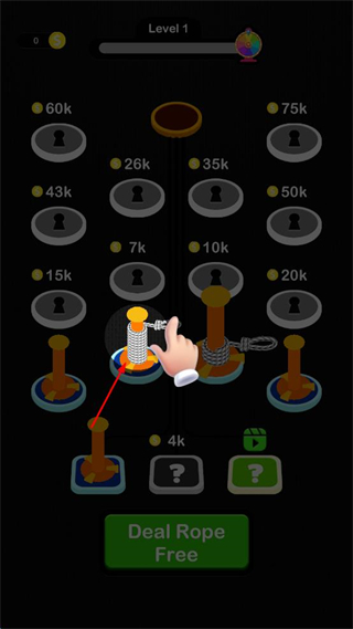 1、進(jìn)入軟件第1關(guān)界面,找到帶有繩索的立柱,點(diǎn)擊該立柱上的繩索,開啟繩索解開操作。
