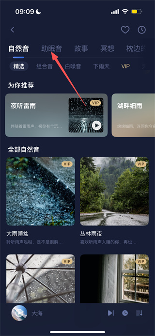 2、在自然音頁面,點(diǎn)擊助眠音標(biāo)簽,切換至助眠音頁面。