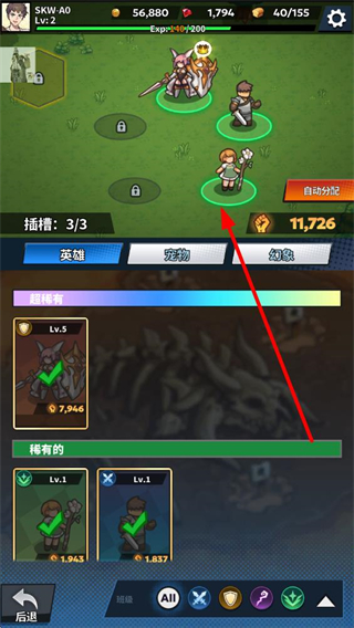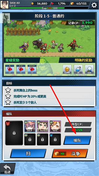1、進(jìn)入關(guān)卡界面后點(diǎn)擊編隊(duì)按鈕,進(jìn)入英雄選擇頁(yè)面,部署陣容提升陣型戰(zhàn)力。