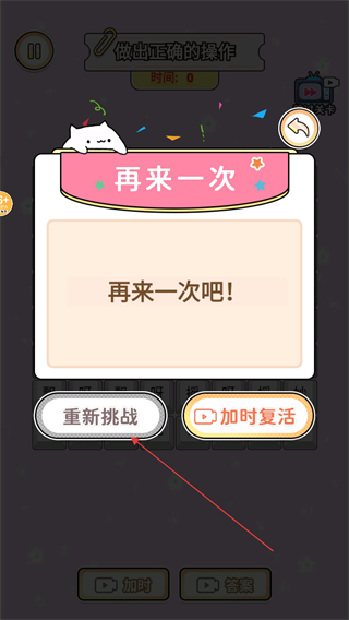 4、若時(shí)間耗盡未完成文字拼接,界面會(huì)彈出再來一次的提示框,點(diǎn)擊重新挑戰(zhàn)按鈕即可再次進(jìn)入該關(guān)卡。