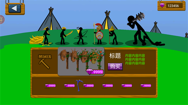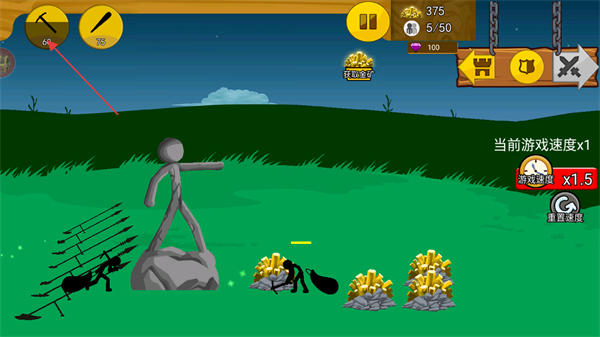 2、點擊左上角的按鈕可以花費金幣召喚出陣營的火柴人,進行挖礦和進攻等操作。