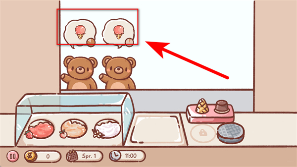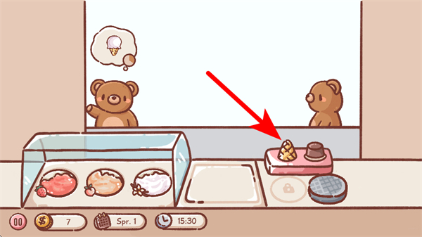 2、查看顧客需求如小熊想要的冰淇淋樣式,從展示柜中選取對應(yīng)口味的冰淇淋,準(zhǔn)備制作。