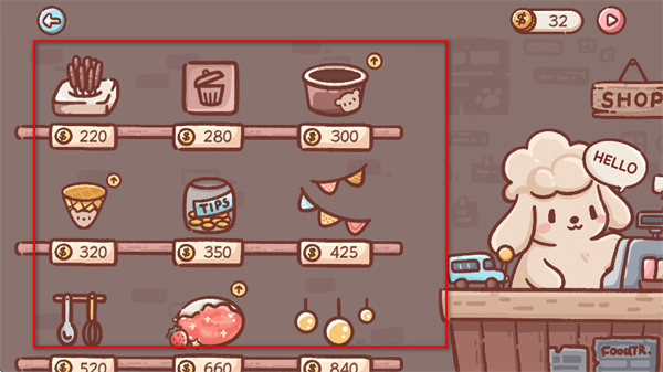 4、在商店界面,消耗收益解鎖新的食材、工具等道具如容器、裝飾,提升冰淇淋車的經(jīng)營能力。